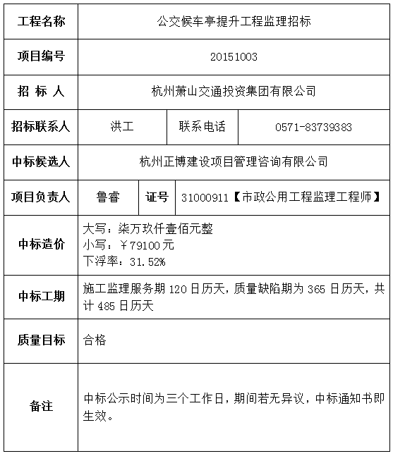 本工程于2015年 11月 13 日在杭州蕭山交通投資集團(tuán)有限公司(蕭山區(qū)經(jīng)濟(jì)技術(shù)開發(fā)區(qū)華瑞中心1幢5樓)會(huì)議室公開開標(biāo),經(jīng)評(píng)標(biāo)委員會(huì)推薦,現(xiàn)對(duì)擬中標(biāo)人進(jìn)行公示: