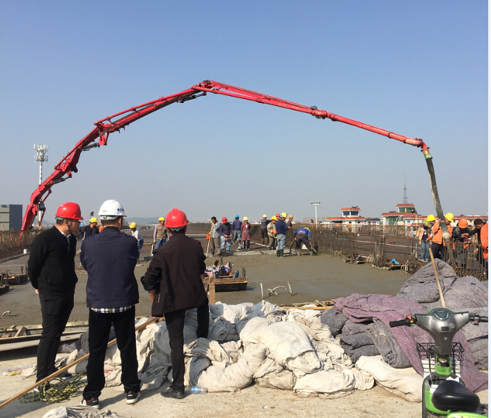 此處箱梁頂板于11月9日上午8時開始澆筑,邀請了監理辦和設計院監督、指導,并配備現場質檢員、現場安全員、試驗員、電工、收料員、支架監控等28名工作人員,實行24小時工作制,在工作人員兩天一夜的辛苦忙碌、用掉1524方砼之后于10號下午5點正式結束。
