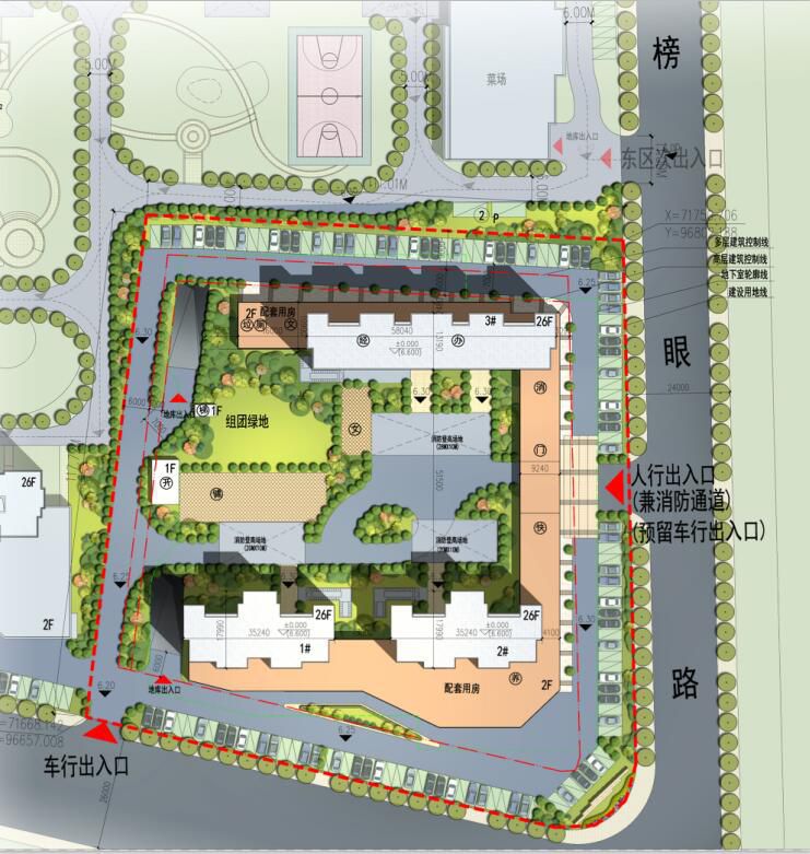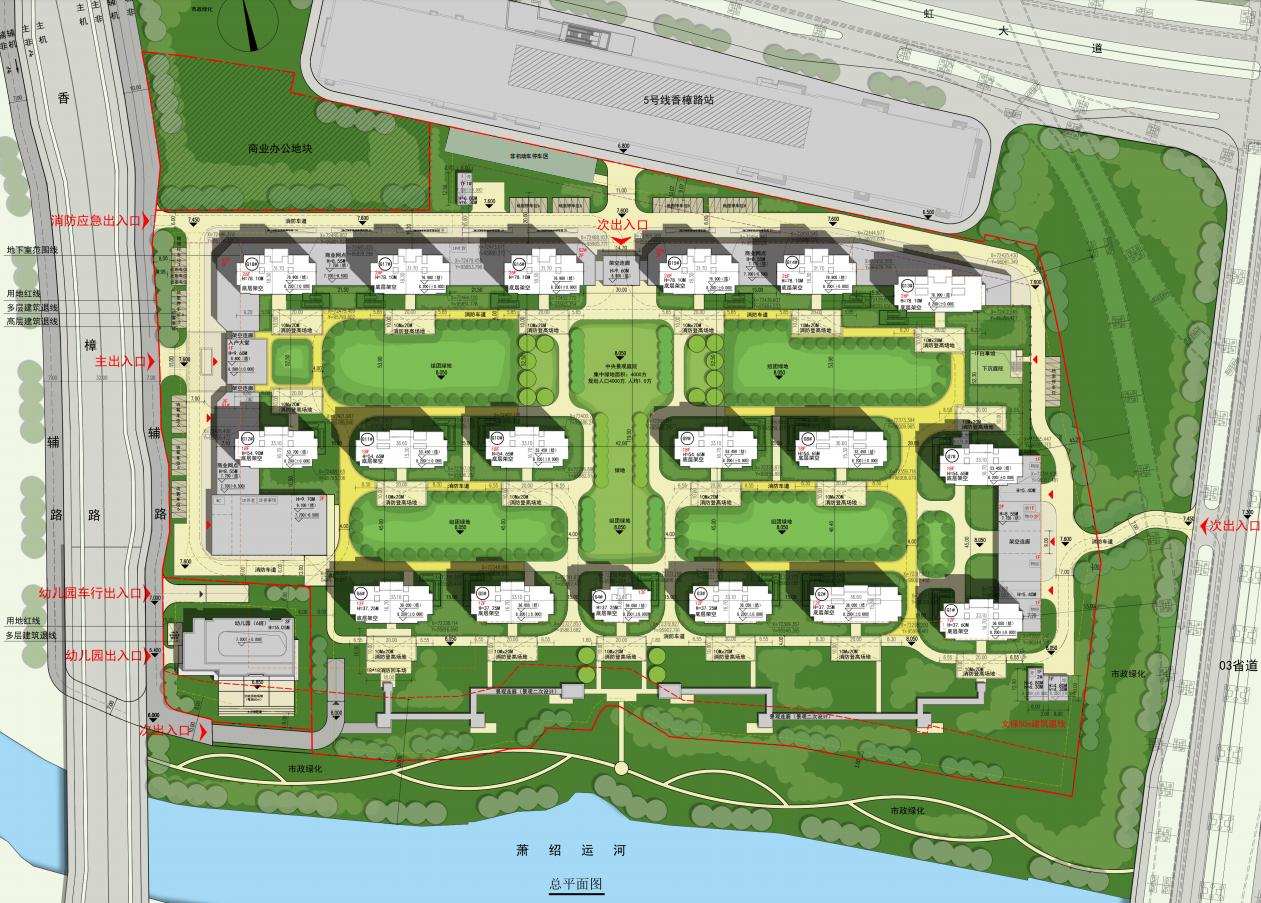 本項目地塊位于蕭山區新塘單元。東臨 03 省道,南至蕭紹運河,西面為香樟路,北面為 5 號線香樟站。其中 A-01 地塊為居住用地,設計內容為住宅及沿街商業配套服務用房、物管辦公用房、物業經營用房、社區管理用房、社區養老用房、郵政服務用房、公廁、設備用房等;A-02 地塊為幼兒園用地,設計內容為 6班幼兒園。該地塊總建筑面積為239371平方米,地塊內設置70方、90方、120方、140方四種戶型,安置總套數為1225套。本項目住宅為 12、18、26 層建筑,順應地形呈總體“對稱”布局,圍合形成開闊的中心花園區及組團綠地。