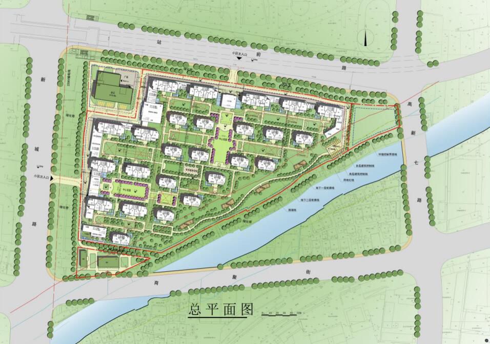 本項目地塊位于蕭山區鐵路蕭山站綜合交通樞紐區,東至高新七路綠化帶,南至蕭紹運河綠化帶,西至新城路綠化帶,北至站前路綠化帶。場地總用地面積為67700平方米,場地整體形狀為三角形不規則形態。該地塊總建筑面積為207334平方米,地塊內設置70方、90方、120方、140方四種戶型,安置總套數為1008套。