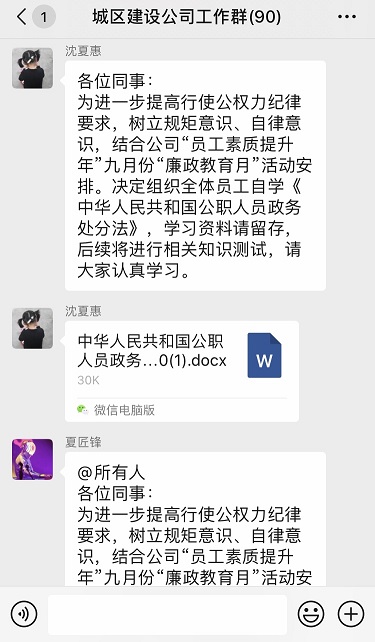 為進(jìn)一步強(qiáng)化公司黨風(fēng)廉政建設(shè),根據(jù)公司“員工素質(zhì)提升年”——9月“廉政教育月”活動(dòng)的安排,城區(qū)建設(shè)公司組織全體員工組織全體職工自行學(xué)習(xí)《中華人民共和國(guó)公職人員政務(wù)處分法》,并開(kāi)展線上廉政知識(shí)測(cè)試。