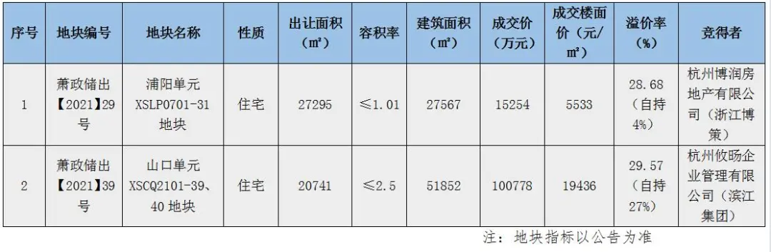 該地塊位于蕭山區浦陽鎮,東至融創地塊、南至橫四路、西至山體、北至縱二路,規劃性質為居住用地 ,掛牌起始價為11854萬元。經過 21 輪競價,杭州博潤房地產有限公司(浙江博策)以 15254萬元總價競得,樓面價5533元/平方米,溢價率28.68 %,競配自持比例4%。