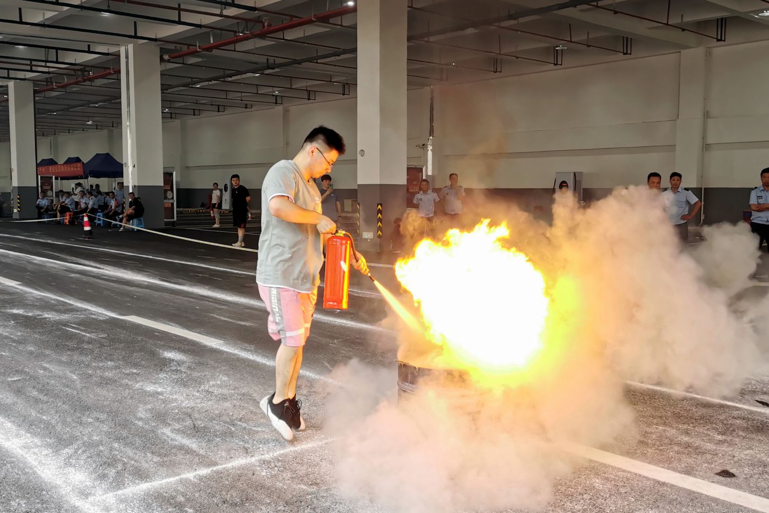 本次比武設置了消防理論知識考試、50米4公斤干粉滅火器滅火、雙手提消防水帶4×50M接力賽、消防水帶二人三帶操作等4個項目,共有10支隊伍參與角逐。隨著裁判喊出“開始!”的口令,各參賽隊迅速進入狀態,選手們拋接水帶快速有力、滅火噴灑精準到位,將平日的訓練水平表現得淋漓盡致,贏得觀眾的陣陣喝彩,現場氛圍甚濃。