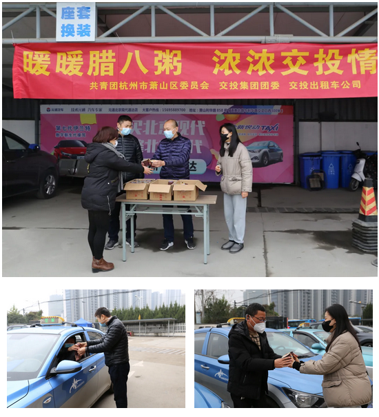 交投出租車公司行政人員在出租車服務區向廣大駕駛員發放臘八粥,并叮囑駕駛員在新的一年要加強疫情防護,確保安全行車。
