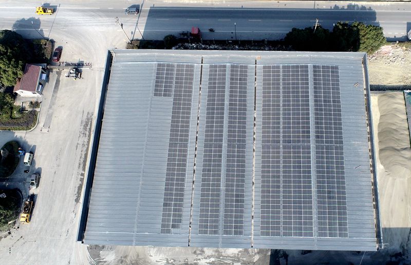路橋工程公司與浙江中新電力工程建設有限公司合作,在路橋工程公司瀝青混凝土拌和中心新建堆料倉屋頂上(面積為3150㎡)安裝光伏發電系統。投入使用后,拌和中心光伏電站年均發電量約28萬度,將為瀝青拌和中心生產節省很大一部分電費支出。同時,也為建立一家“低碳瀝青拌和中心”甚至“零碳瀝青拌和中心”打下堅實基礎,逐步實現生產基地“綠色能源”的自給自足。