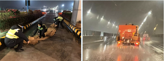 機場高速公司嚴陣以待,迅速部署抗雪防凍工作,第一時間按預案成立領導小組和組織應急搶險隊,24小時在崗待命執(zhí)行任務,組織人員和機械設備,對匝道、收費廣場、橋面、坡道等重點監(jiān)控路段撒布融雪劑、鋪設防滑草袋進行除雪保暢。正月初二夜間共出動撒鹽機3臺次,撒布融雪劑12噸,投入搶險人員20余人,預警巡邏車4輛次。