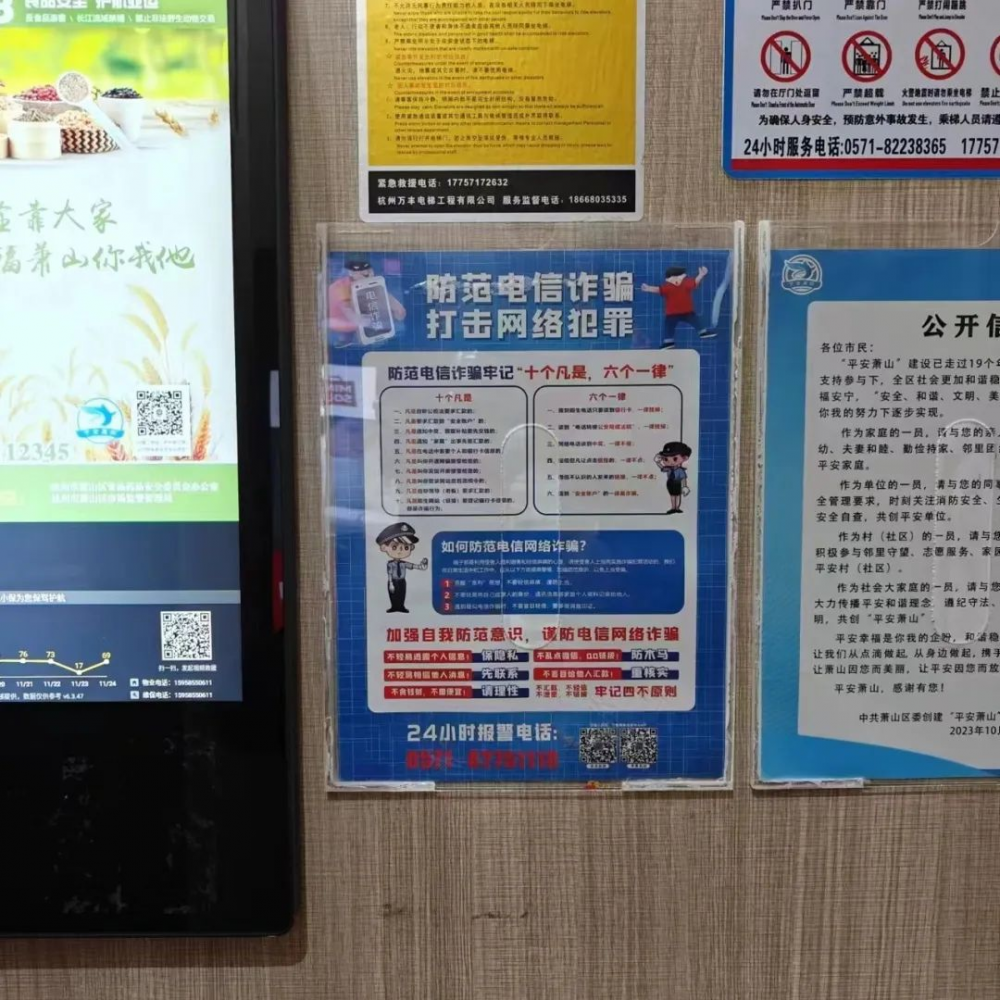各項目在主要出入口、電梯廳、小區游樂場等人流量密集的公共區域張貼防范電信網絡詐騙宣傳海報,擺放宣傳展板,做到“既要鋪天蓋地,又要重點精準”,對“重點窗口”采取面對面宣傳,拓展受眾面。不斷提醒小區居民,提升反詐意識。