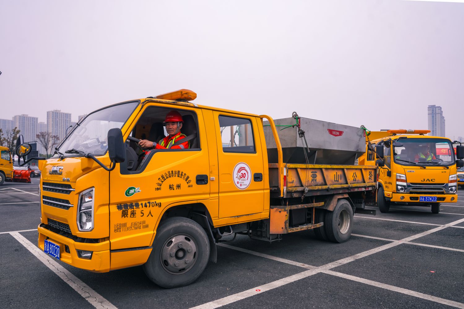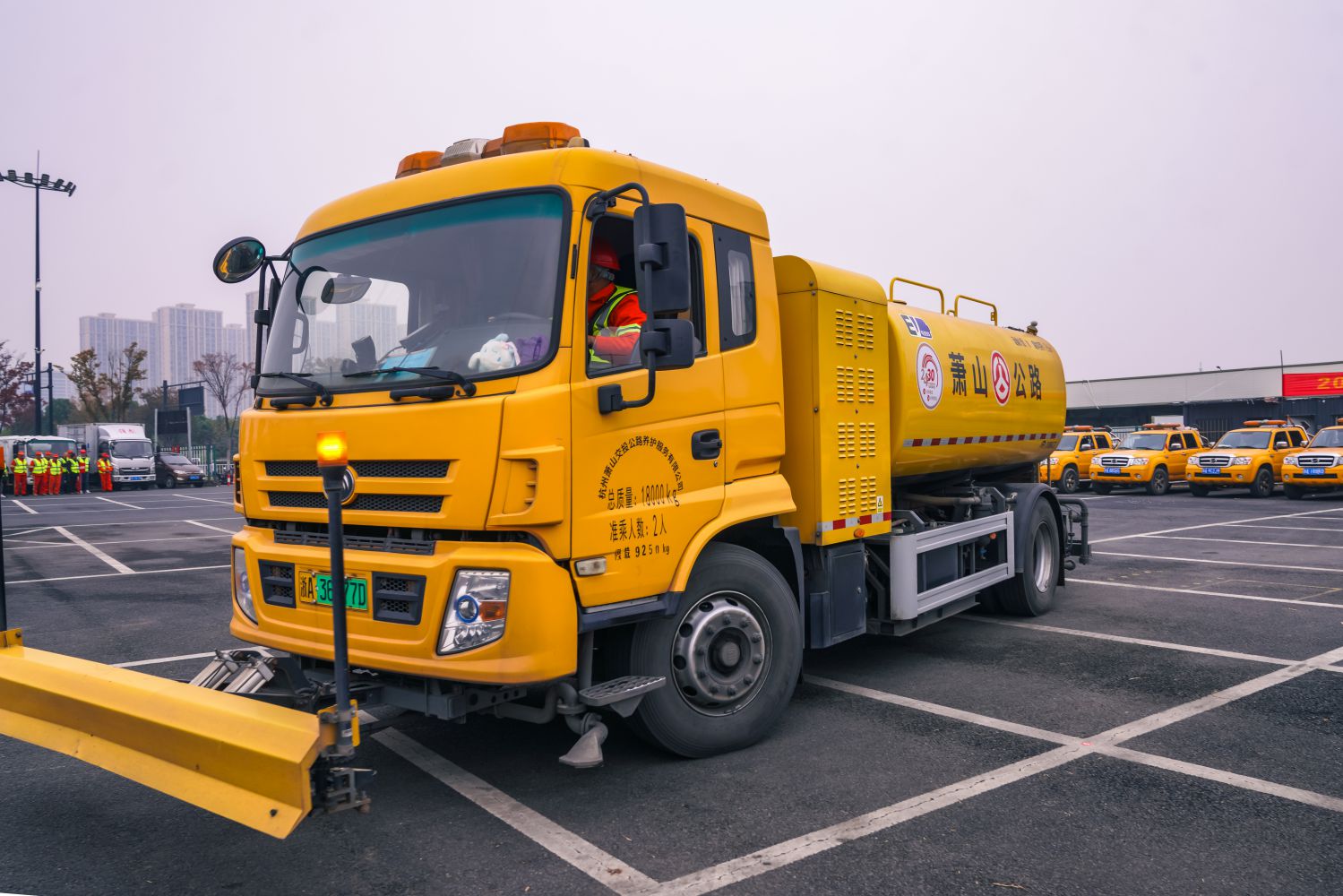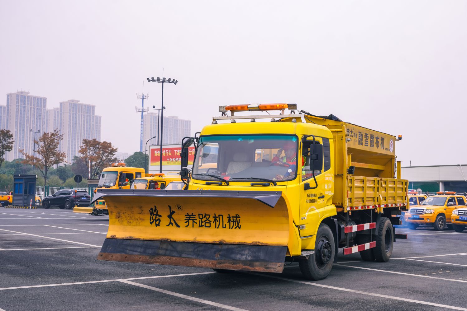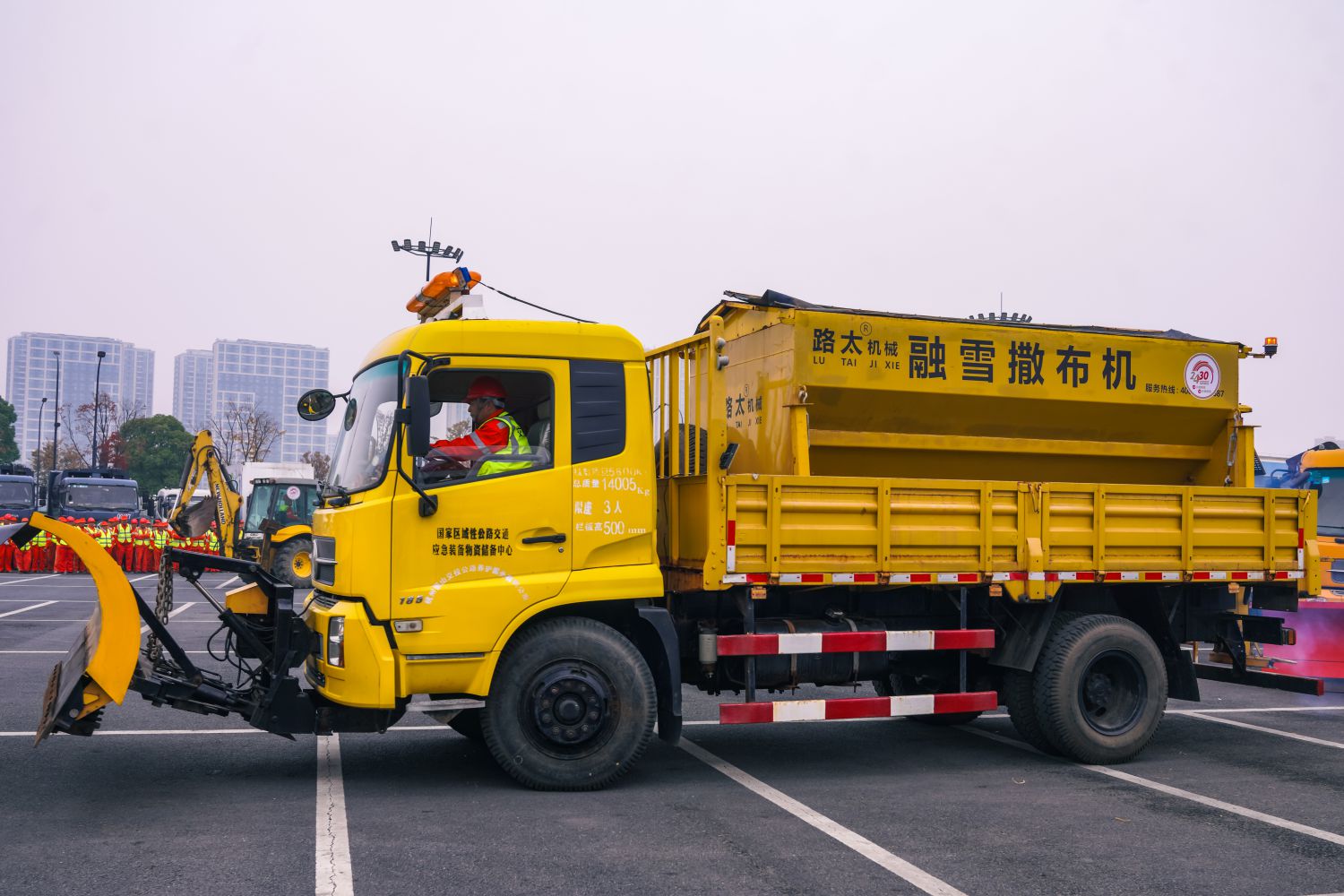 載有中型撒鹽機(jī)的養(yǎng)護(hù)作業(yè)車(chē),載鹽量2噸,作業(yè)寬度3.5米,作業(yè)時(shí)長(zhǎng)1小時(shí),主要用于保障主干以外道路的防雪抗冰凍。