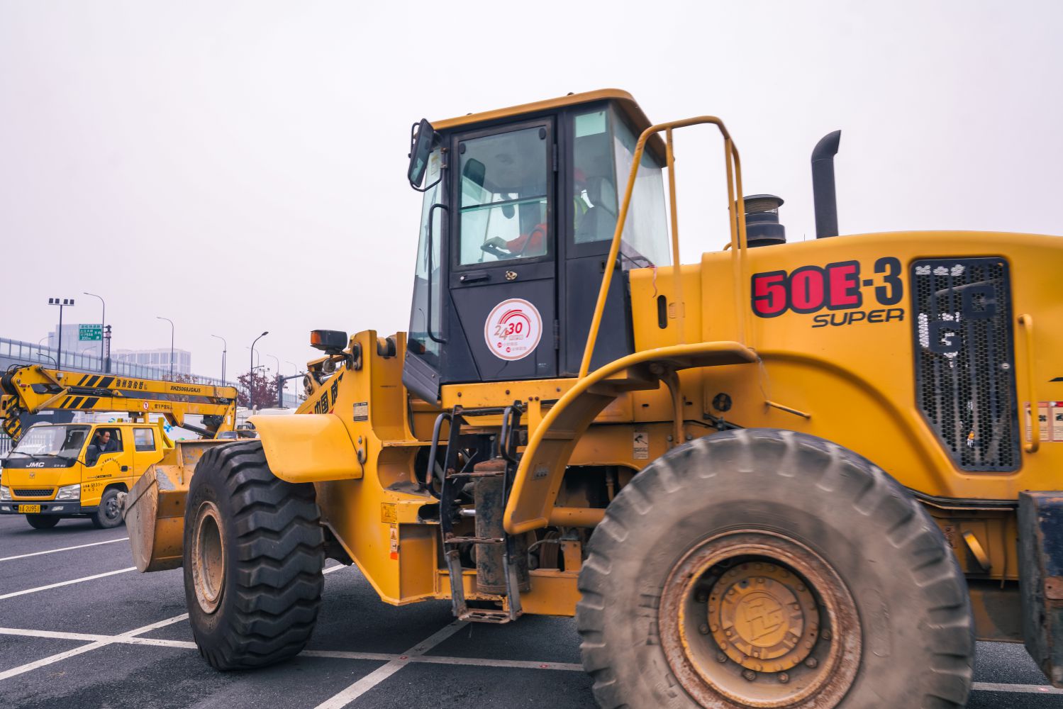 50裝載機(jī),在降雪天氣可以利用鏟斗進(jìn)行除雪,在雪量大時(shí)鏟斗可換裝推雪塊,用于道路除冰。