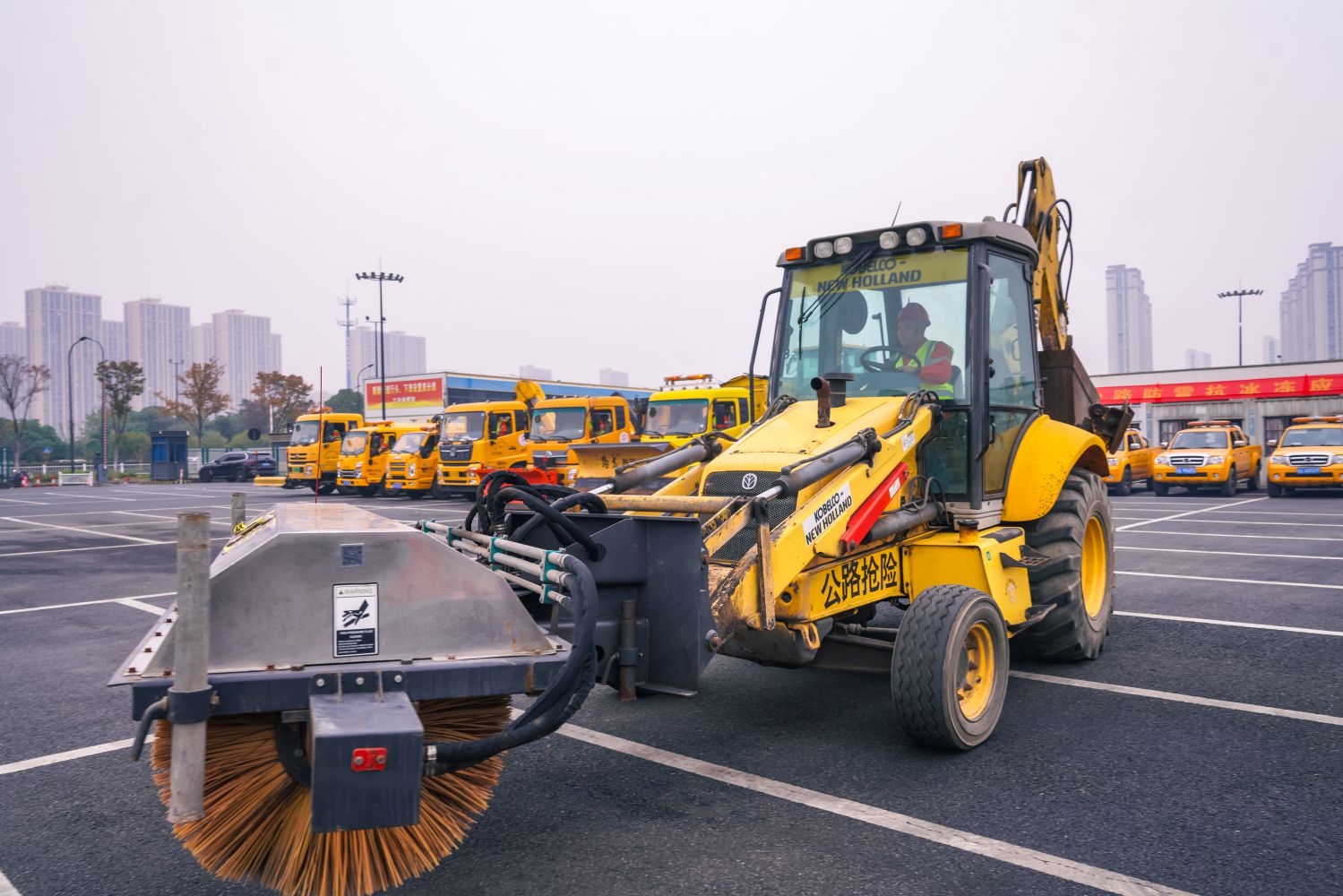 挖掘裝載機(jī),俗稱(chēng)“兩頭忙”,該設(shè)備同時(shí)具備挖掘與裝載功能,在降雪冰凍天氣,可換裝掃雪器,利用設(shè)備為多功能性,用于道路掃雪除冰。