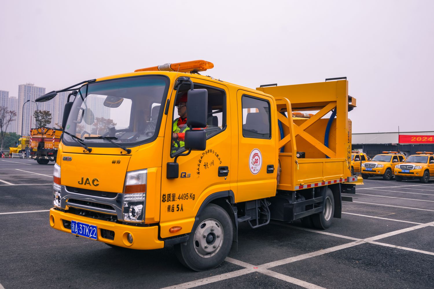 70K防撞車(chē),該車(chē)配備防撞包、顯示屏、高音喇叭,有效保障上路作業(yè)安全。