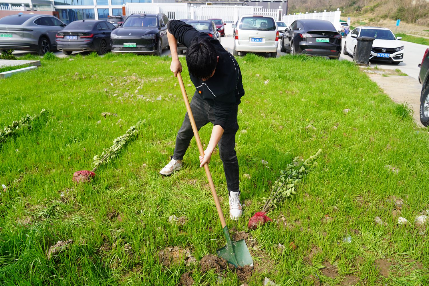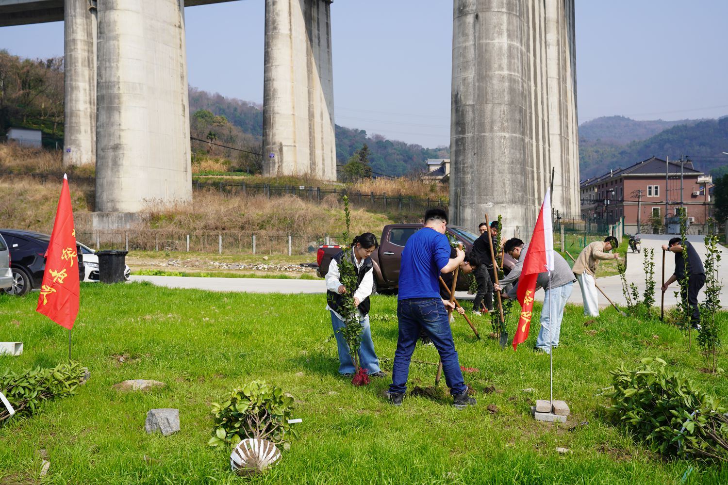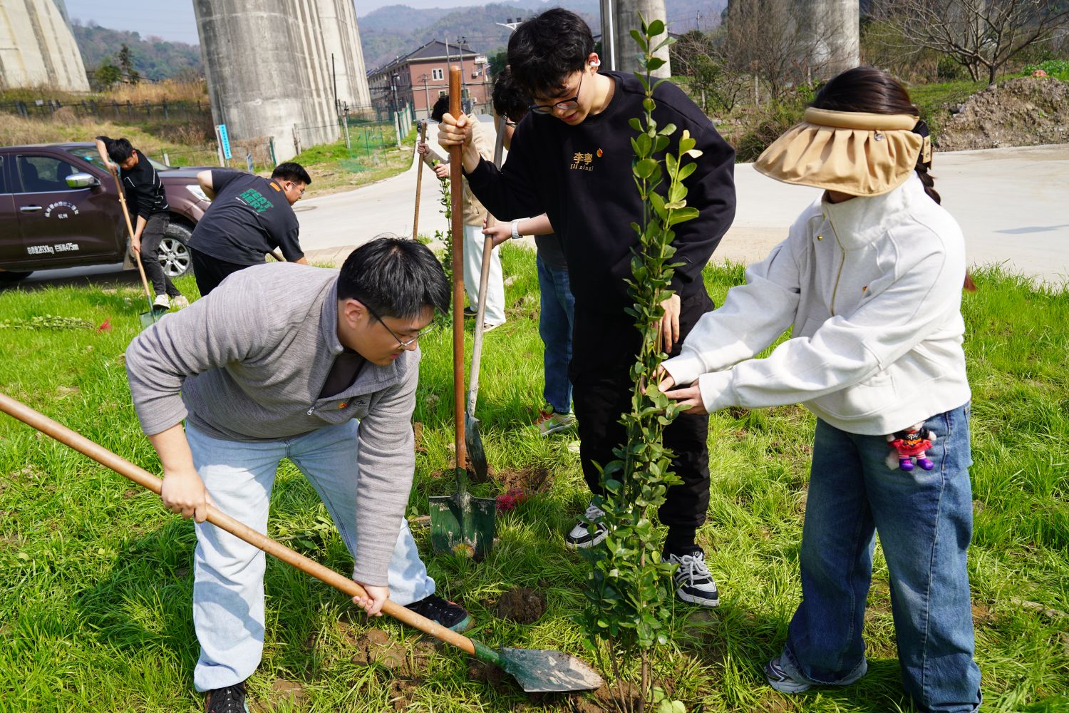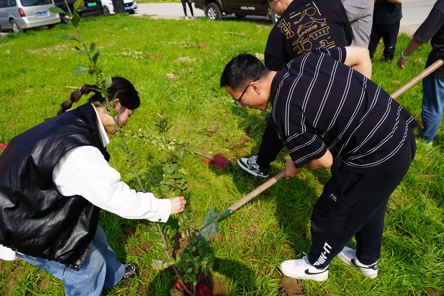 活動(dòng)現(xiàn)場(chǎng),團(tuán)員青年們?nèi)齼沙山M,攜手種下北海道黃楊等樹(shù)苗,他們分工默契——男青年揮動(dòng)鐵鍬挖坑培土、搬運(yùn)樹(shù)苗,女青年細(xì)心調(diào)整植株角度、覆土壓實(shí)。現(xiàn)場(chǎng)既有揮汗如雨的勞動(dòng)場(chǎng)景,也有“土坑再深一點(diǎn)”“樹(shù)苗要扶直”的歡聲笑語(yǔ),青年們額頭沁出汗珠,卻始終干勁十足,展現(xiàn)著路橋青年特有的實(shí)干風(fēng)采。