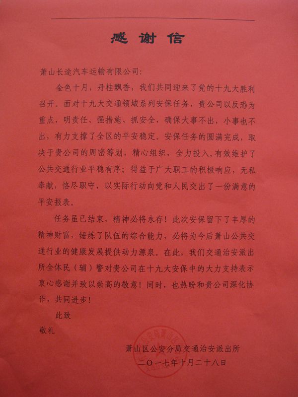 感謝信中提到,“面對十九大交通領(lǐng)域系列安保任務(wù),貴公司以反恐為重點,明責(zé)任、強措施、抓安全,確保大事不出,小事也不出,有力支撐了全區(qū)的平安穩(wěn)定。安保任務(wù)的圓滿完成,取決于貴公司的周密籌劃,精心組織,全力投入,有效維護了公共交通行業(yè)平穩(wěn)有序;得益于廣大職工的積極響應(yīng),無私奉獻,恪盡職守,以實際行動向黨和人民交出了一份滿意的平安報表”。